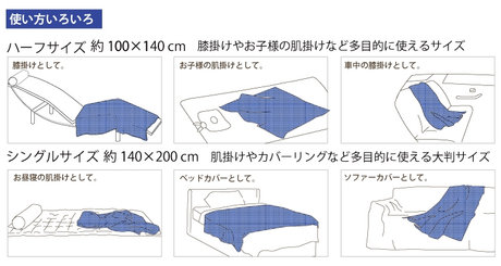 たとえば、Mサイズはお子様の肌掛けや車中・リビングでのひざ掛けとして、Lサイズはベッドカバー・ソファーカバーやお昼寝の肌掛けとしてなど、多目的にご使用いただけます。