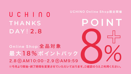 「UCHINO Thanks Day 全品+8%ポイントバック 2/9(月)AM9:59まで!」