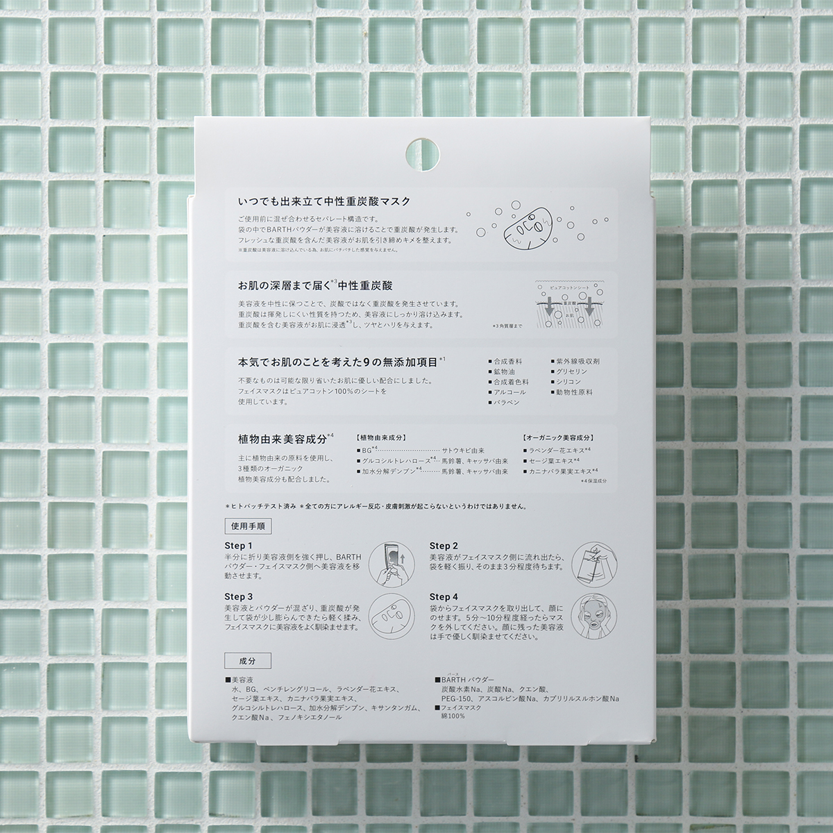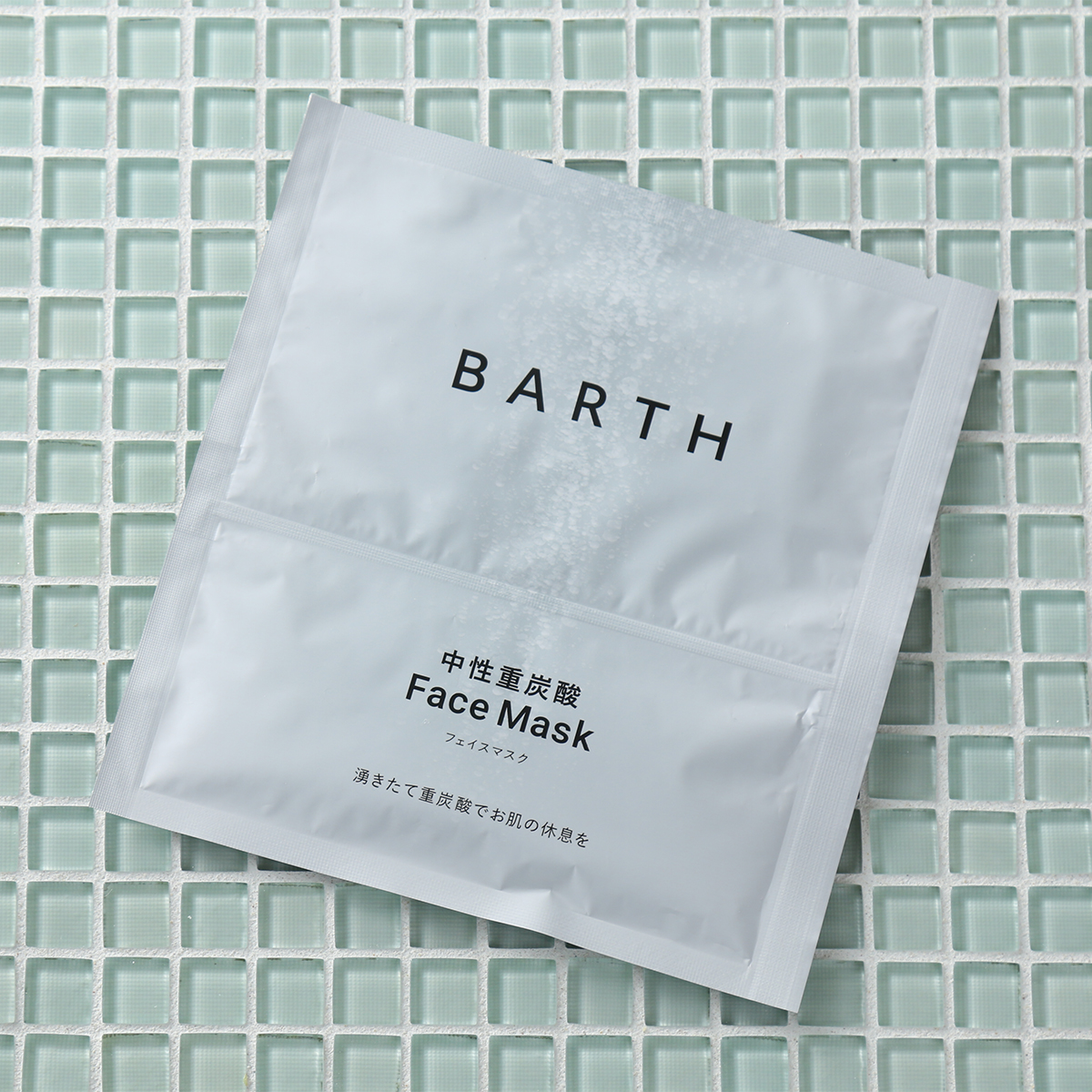 重炭酸イオンがたっぷり溶け込む美容液を使ったフェイスマスクです。ご使用前に混ぜ合わせるセパレート構造で、袋の中で美容液にBARTHパウダーが溶けることで、重炭酸イオンを発生させます。