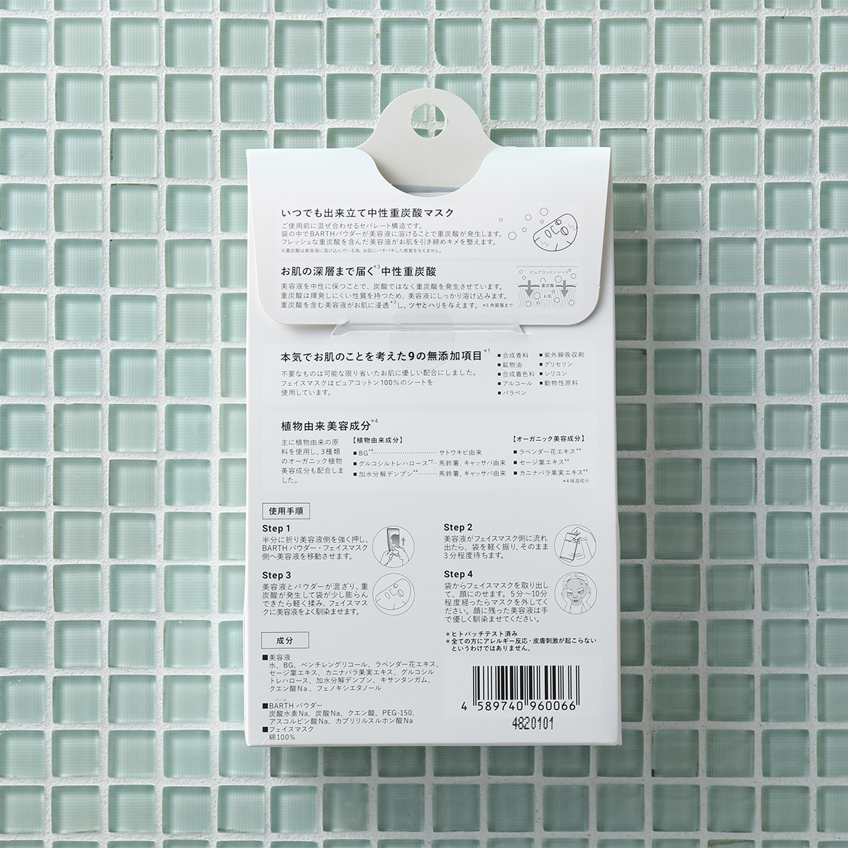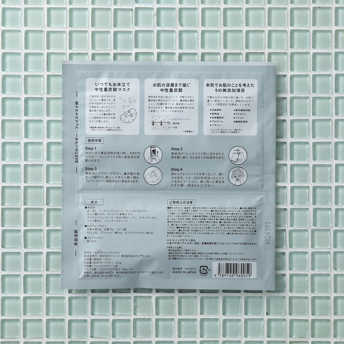 重炭酸イオンがたっぷり溶け込む美容液を使ったフェイスマスクです。ご使用前に混ぜ合わせるセパレート構造で、袋の中で美容液にBARTHパウダーが溶けることで、重炭酸イオンを発生させます。