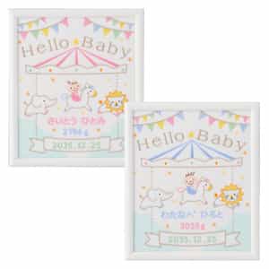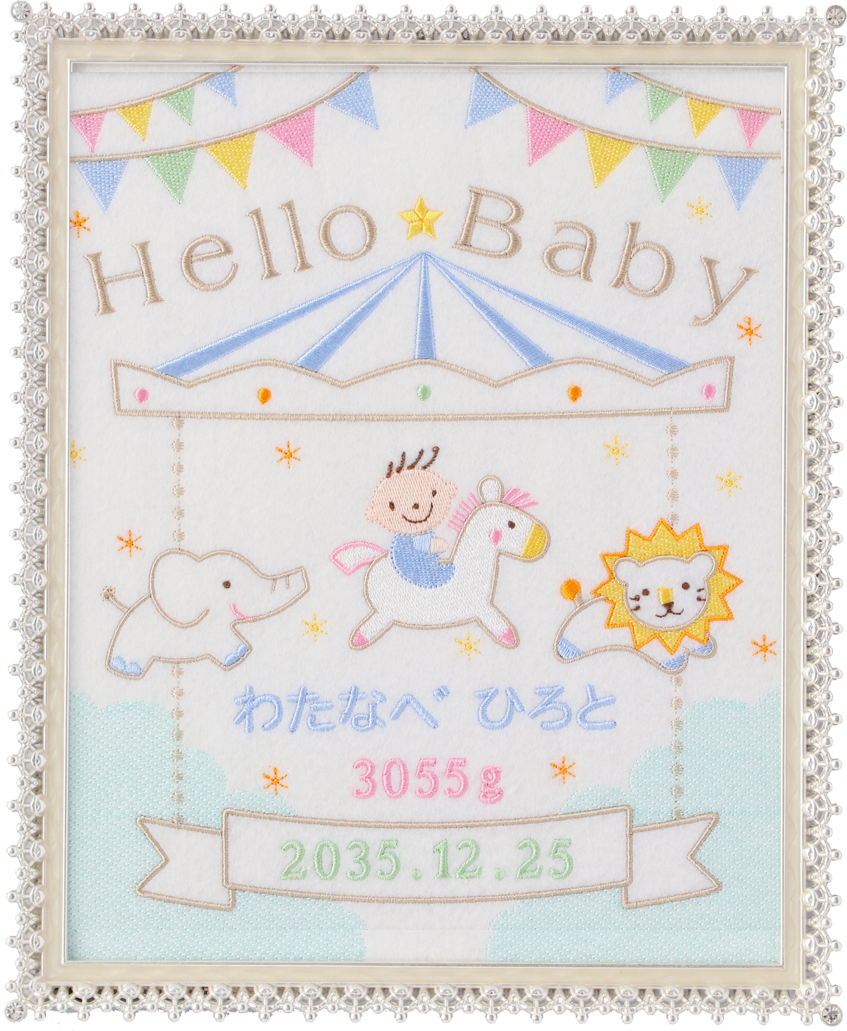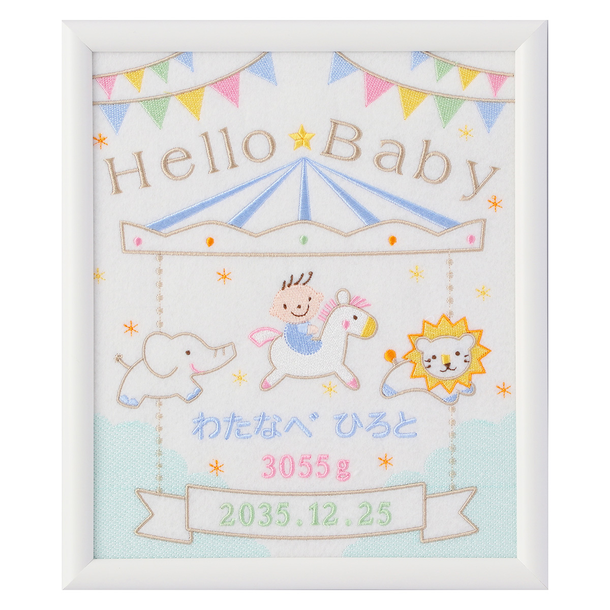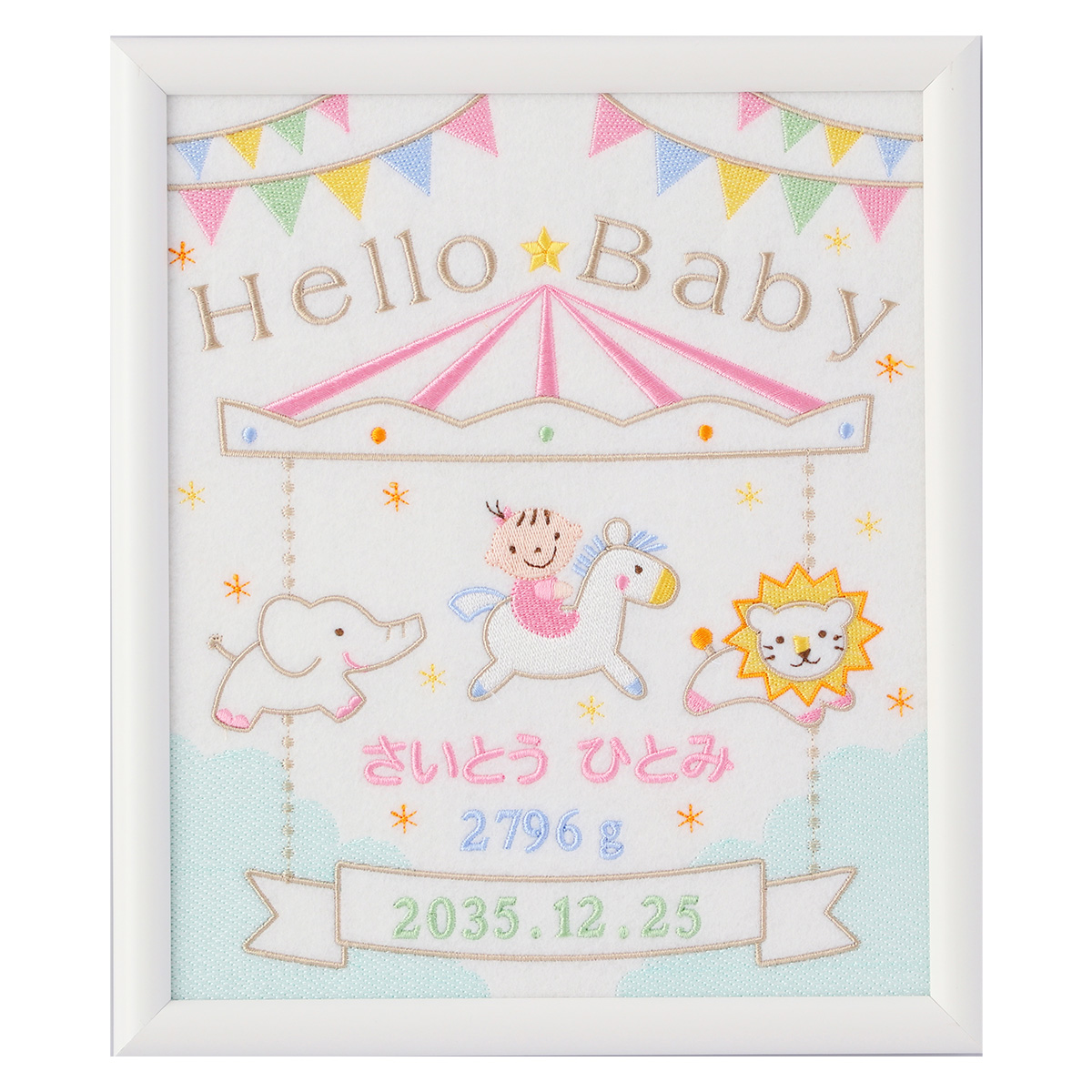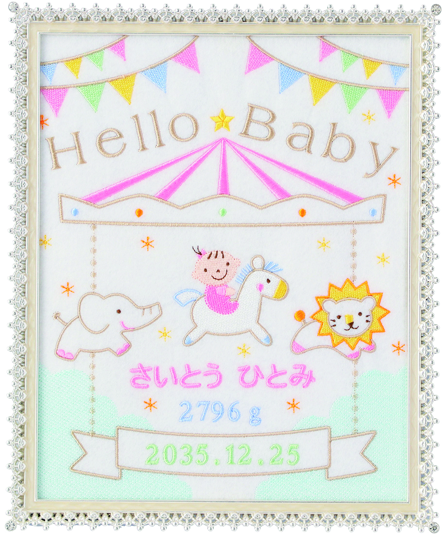 赤ちゃんがメリーゴーランドに乗っているかわいいデザインの刺繍フレームの中に、お名前・生年月日・体重をお入れします。