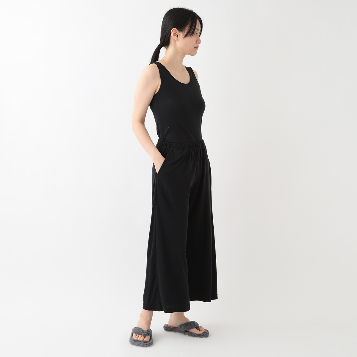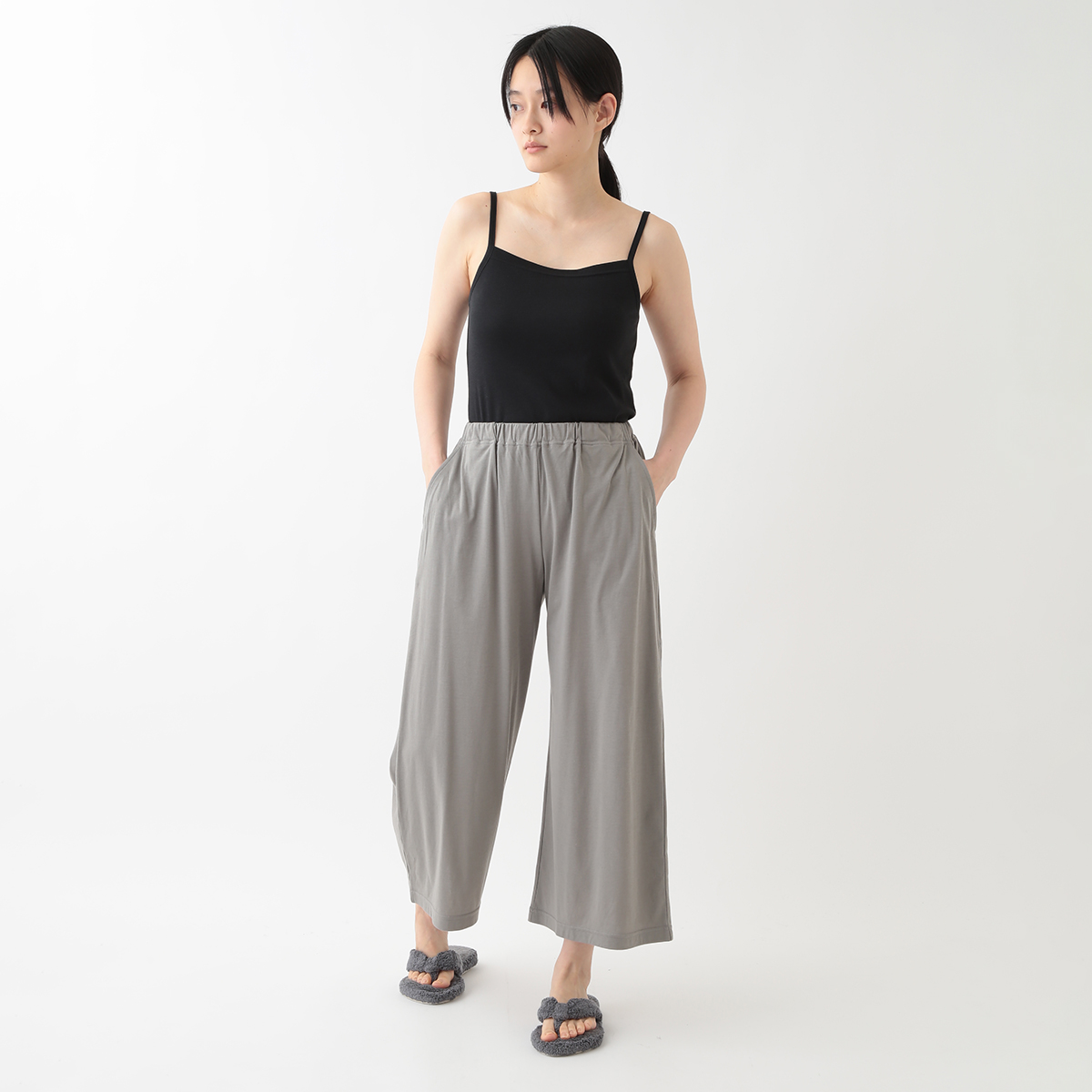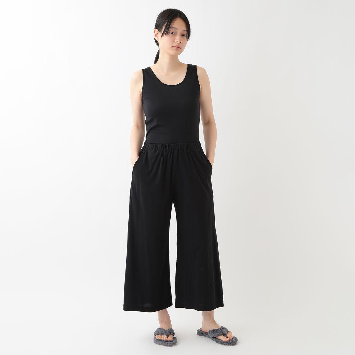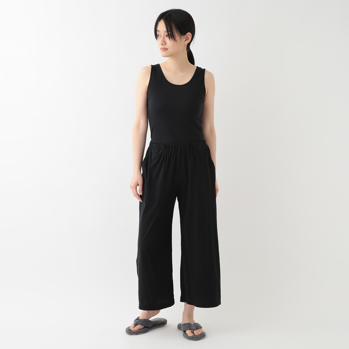 身長160でくるぶしが見える長さです。ストンと落ちる生地でスッキリ見えます。