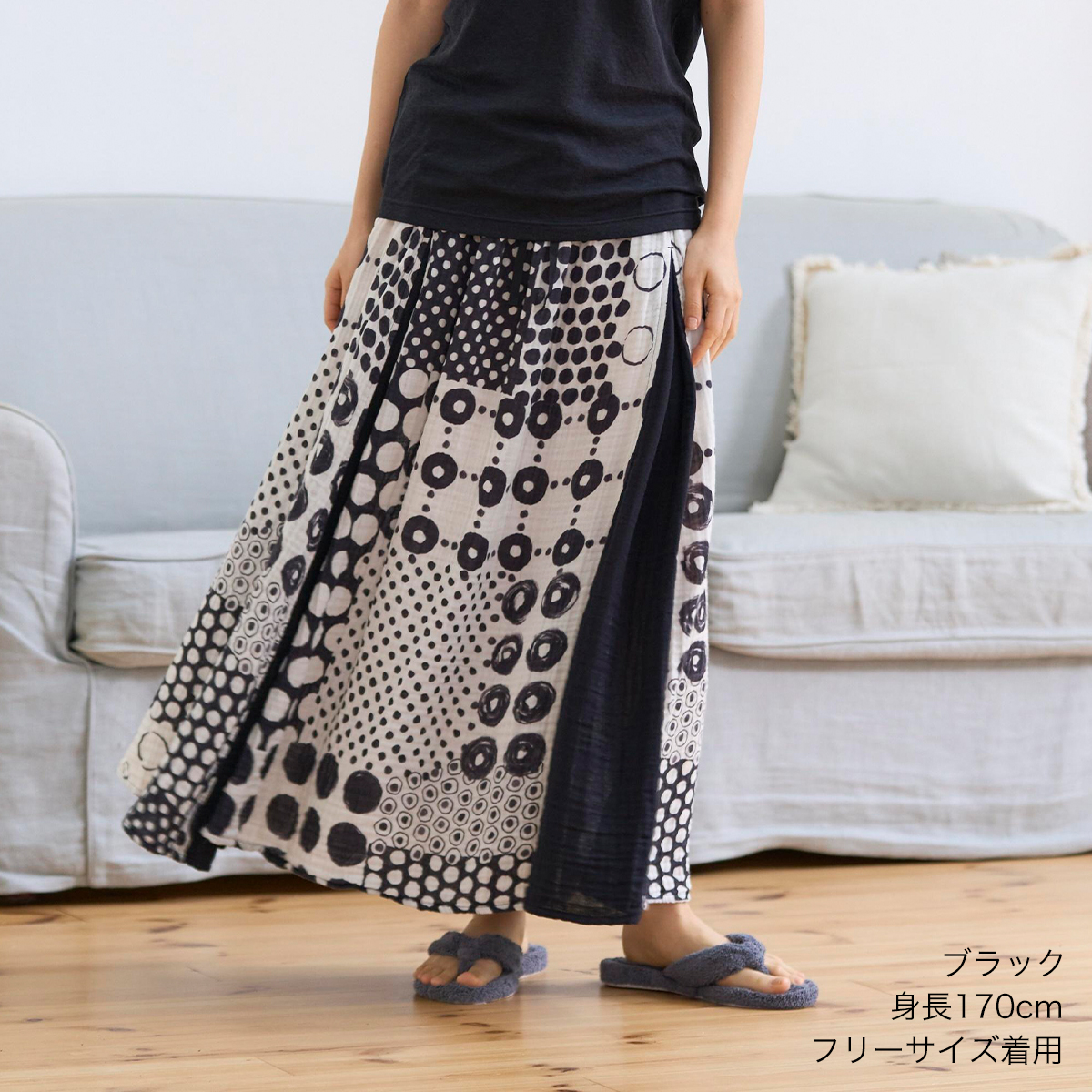 ウエストにはゴムと紐が入っているので、お好みのサイズに合わせてご調整いただけます。