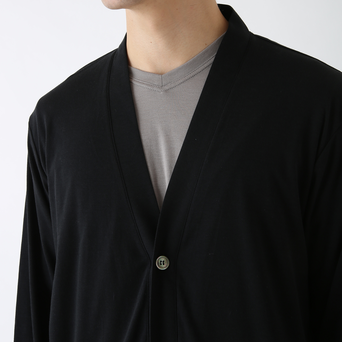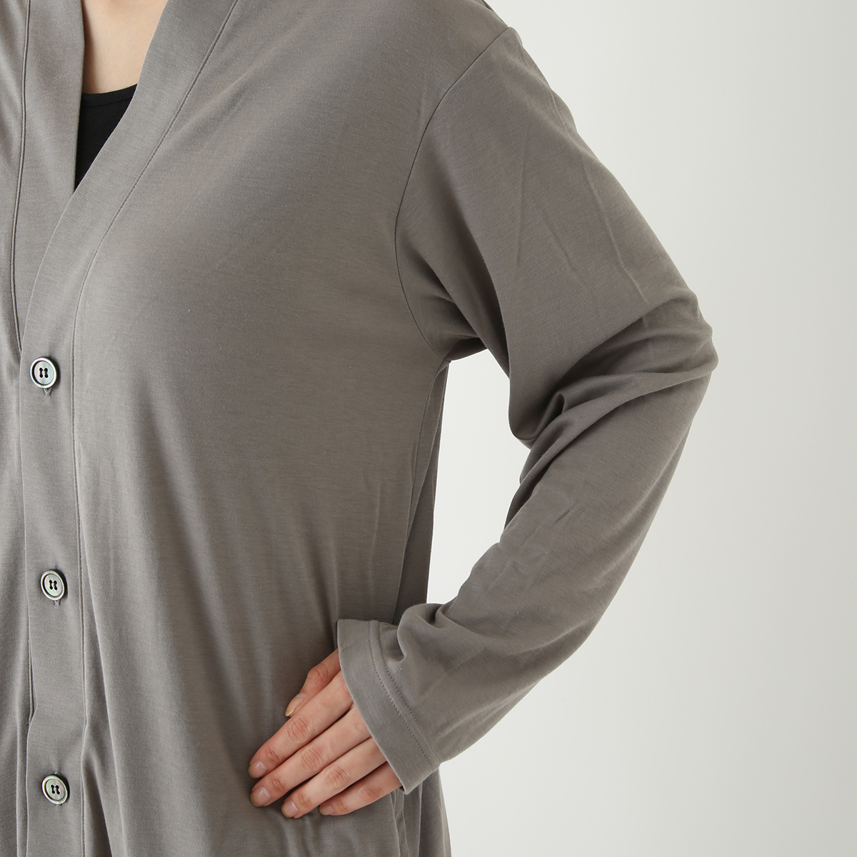 ポタンをしめると首回りが包まれて、ちょうどタンクトップがチラリと見える程度です